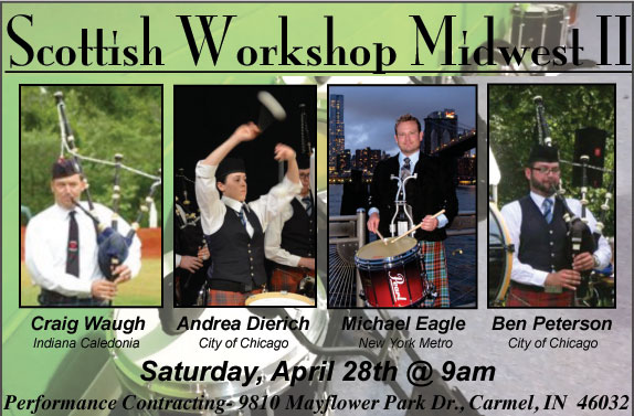 The 2012 pipe band competition season is right around the corner! Gain the competitive edge by improving your musical skills from some of the best Scottish players and teachers in North America. Hosted by the Indiana Caledonia Pipe Band, bring the whole band to beautiful Indianapolis, IN for a weekend of music, learning, fun and entertainment as an All-Star staff works in one-on-one and class room settings to improve all aspects of your bagpiping, snare drumming, tenor drumming and bass drumming. Whether you are advanced, intermediate or have never played before, ICal’s SWM2 will provide professional and reliable instruction for all.