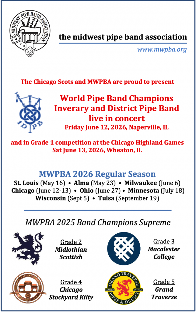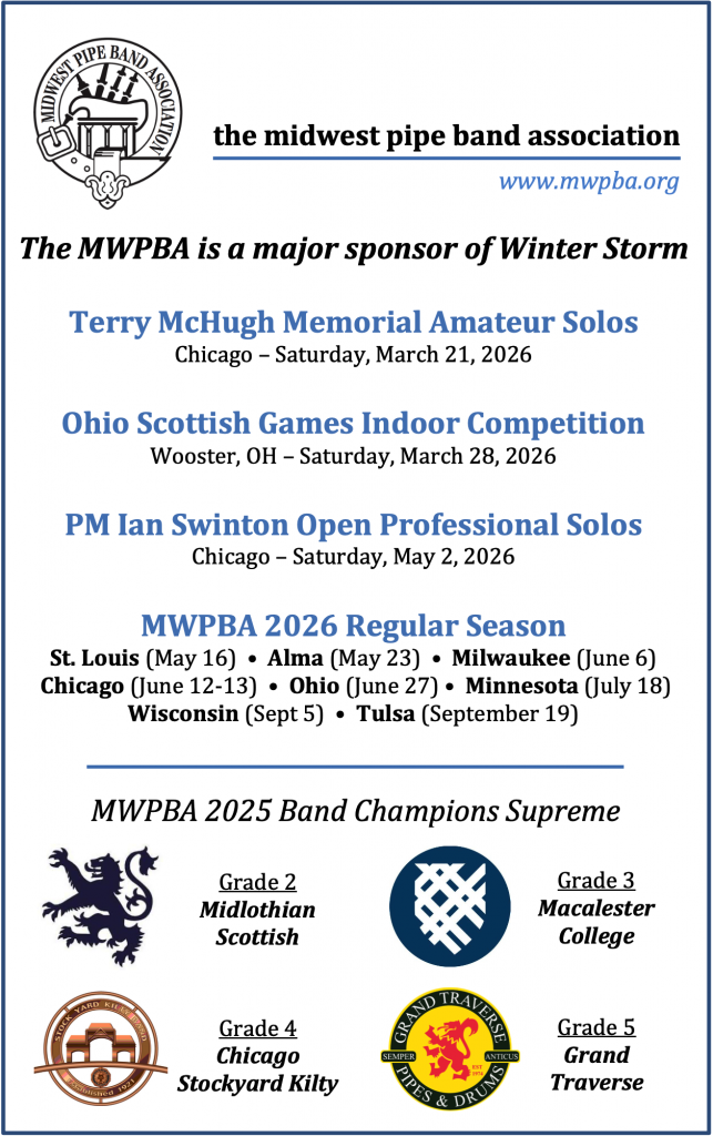 Click here to see the MWPBA program flyers for the upcoming Winter Storm Pipes and Drums Event in Kansas City, Jan 15-18, 2026. Hopefully see you there, or tune in on-line for the Pro contests and concert!